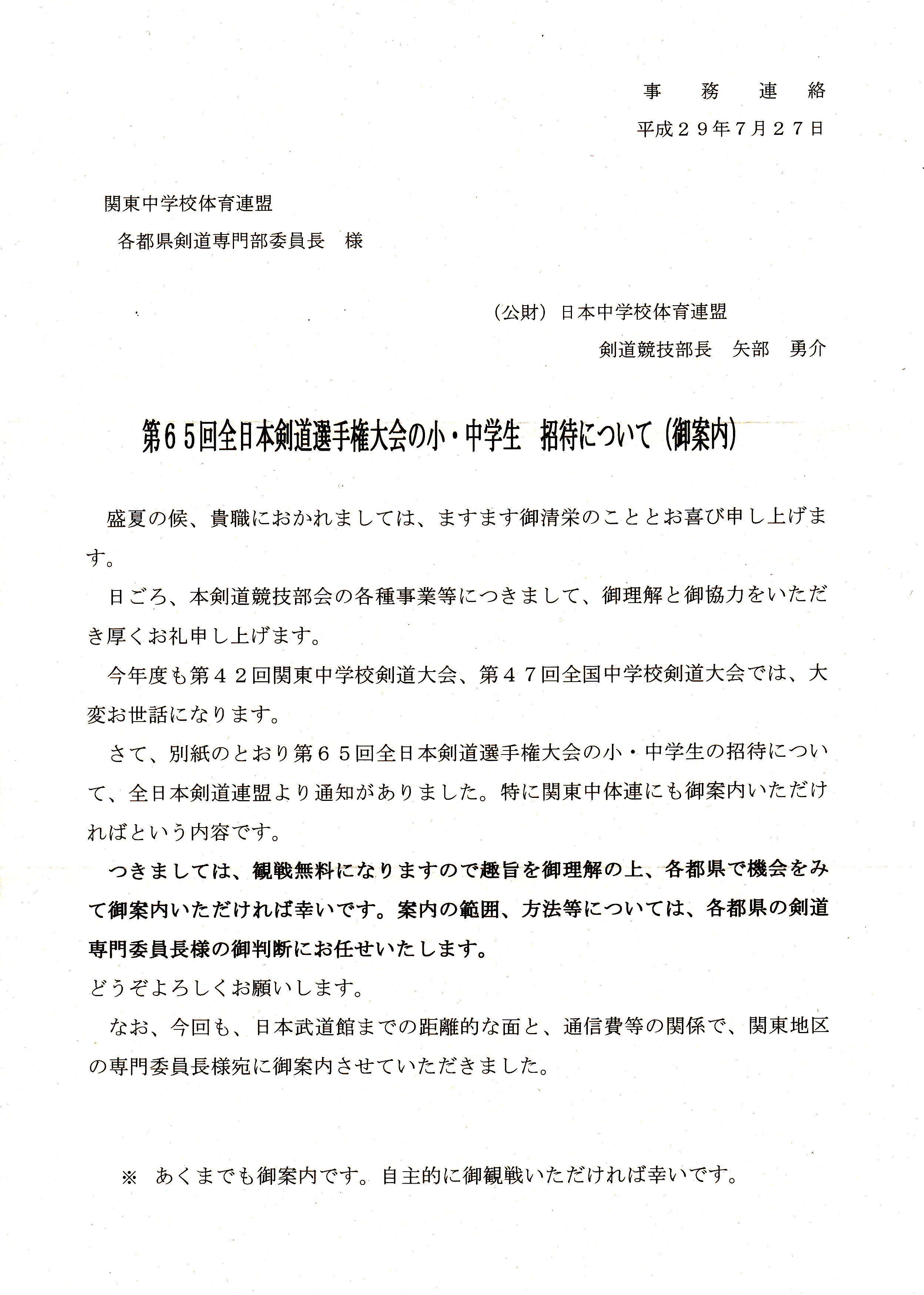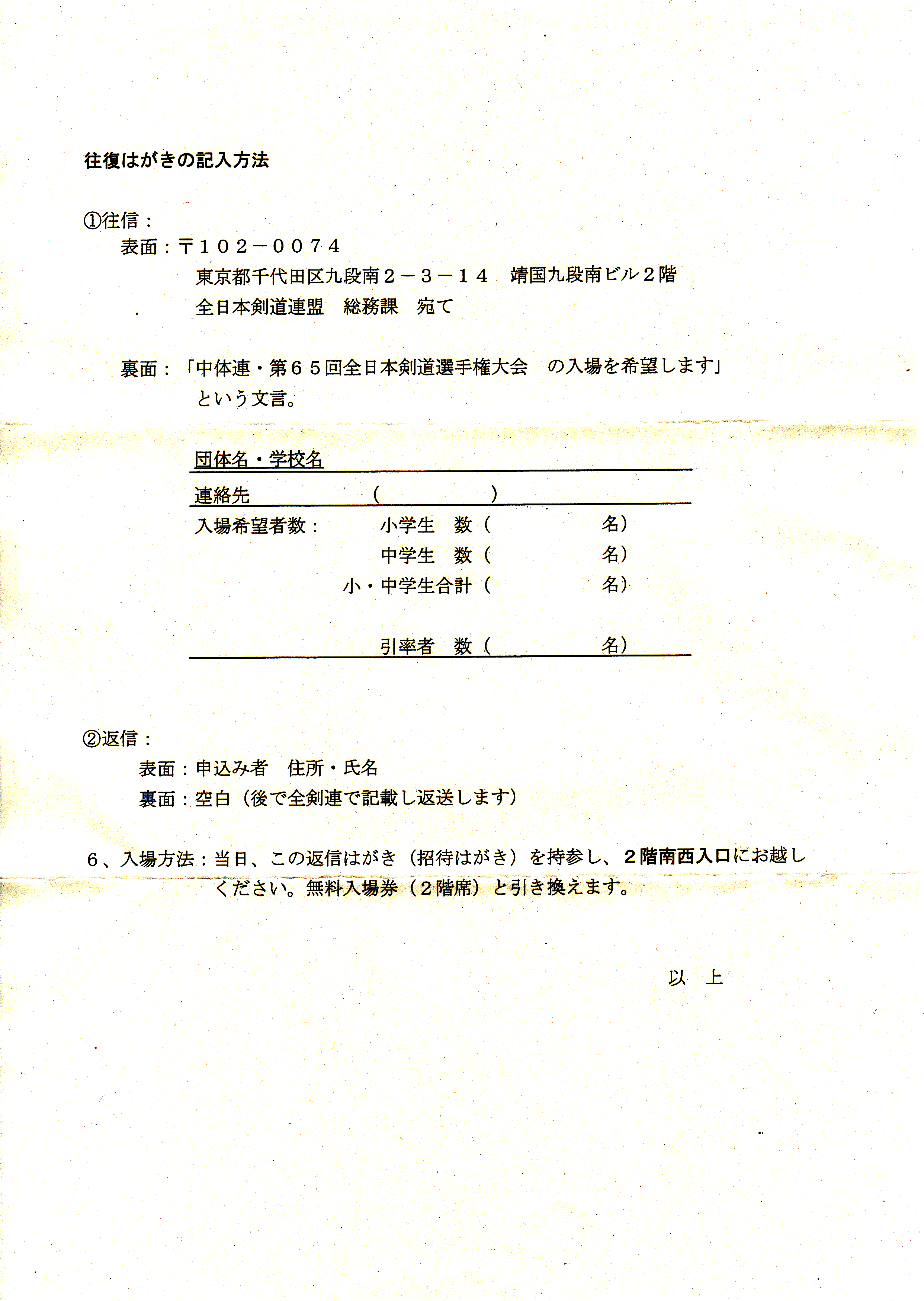 全日本選手権の無料観戦の案内です。希望校は各校で申し込んでください。